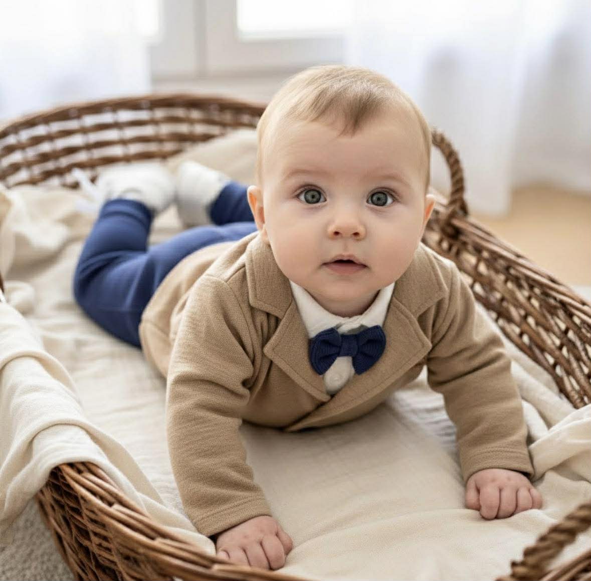 Овој елегантен троделен комплет е создаден за мали господа кои уште од најрана возраст сакаат да изгледаат свечено, а притоа да им биде целосно удобно. Совршен е за крштевки, родендени, семејни прослави, фотографирања и сите посебни моменти кога сакате бебето да изгледа дотерано и стилски.