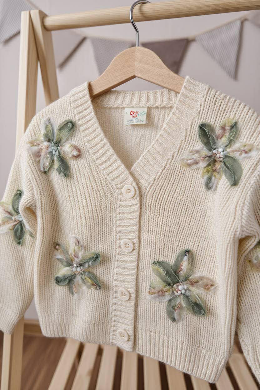 Плетен џемпер во крем боја со декоративни цветни апликации 🌸