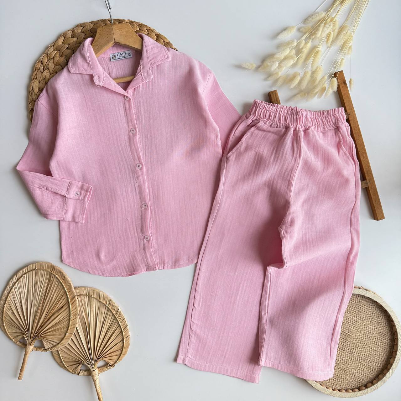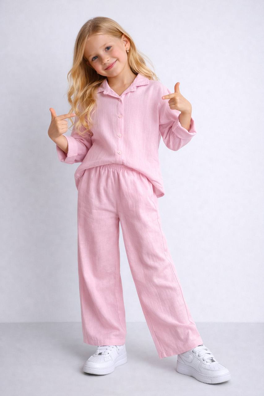 Широки панталони со ластик на половината за удобно носење 👌 Лесни и пријатни, совршени за целодневна активност. Во иста нежно розова нијанса 🎀 што создава убав комплетен изглед.
