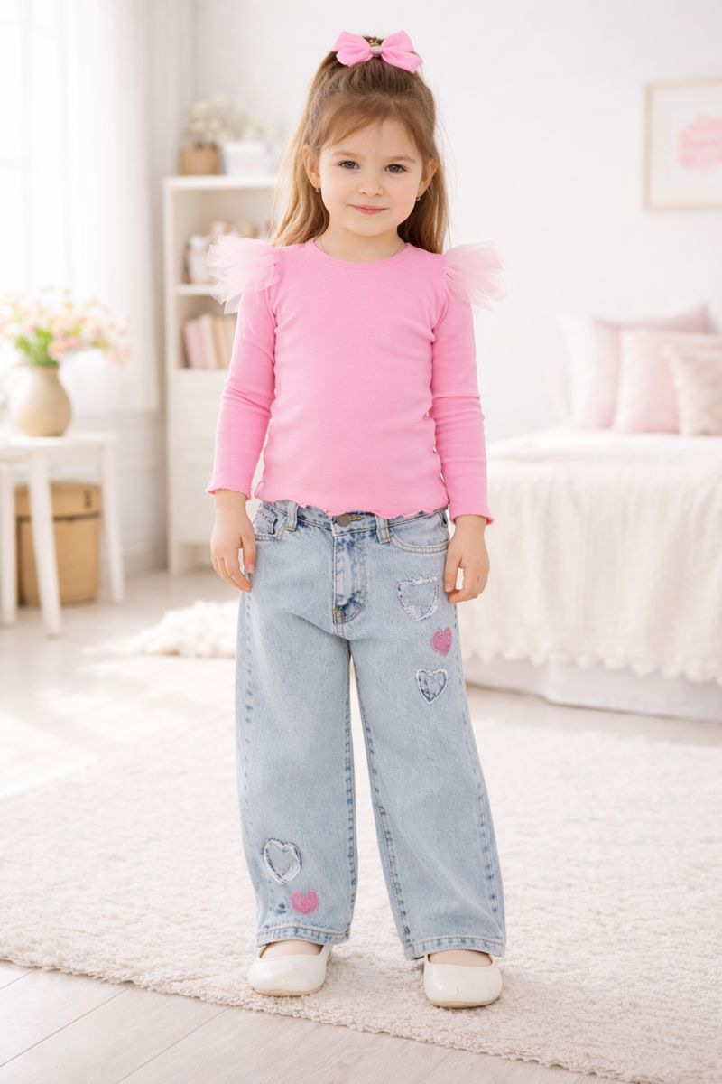 Фармерките се изработени од екстра квалитетен тексас, со модерен поширок крој кој овозможува слобода на движење. Украсени се со симпатични апликации во форма на срциња, што го прави комплетот уште поуникатен и тренди 💕