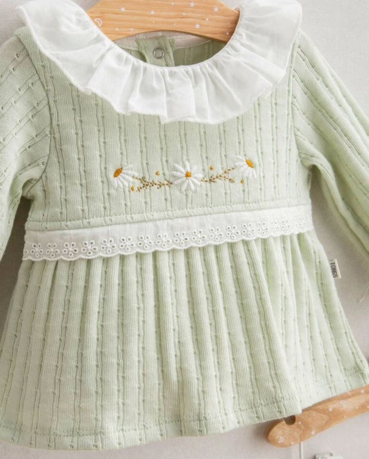 Комплет во два делови. Крем панталончина со тиркизно зелена блузичка на која се извезени цветчина. Овој комплет е на TONGS