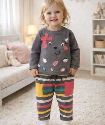 Комплет во два делови. Панталоните се со пруги во неколку бои и на блузата има контури од маче и црвена машничка. Изработени се од висококвалитетен органски памук, кој придонесува чувство на удобност. Овој продукт е на TONGS