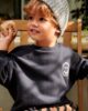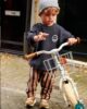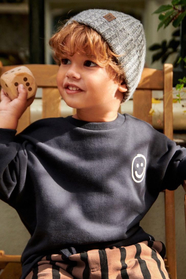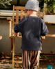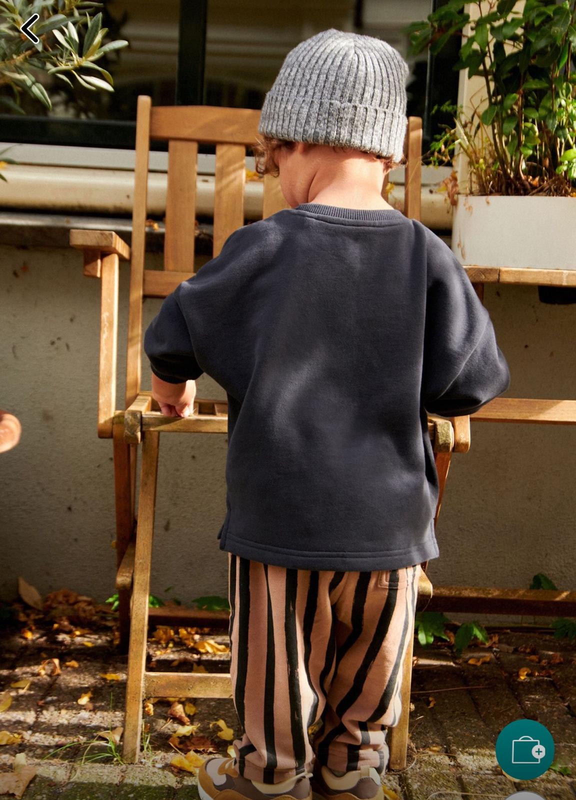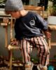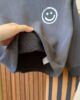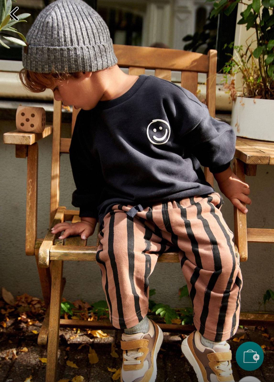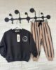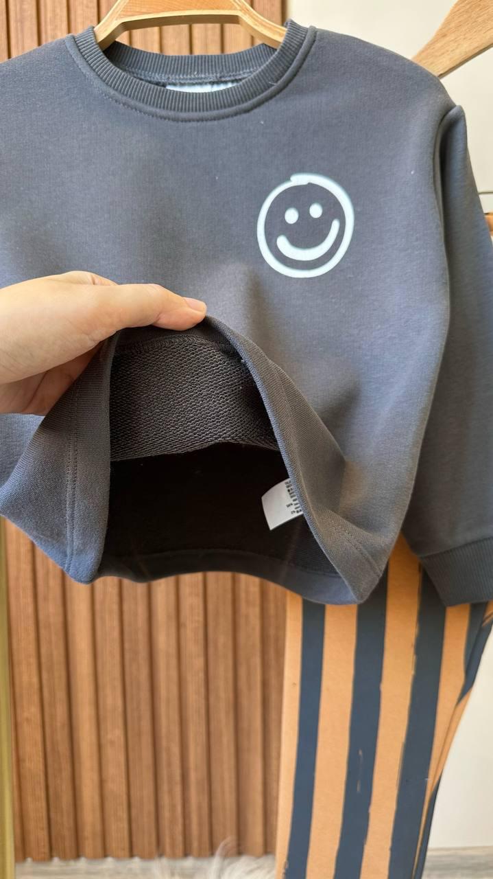 Комплет во два делови. Панталоните се кремови со вертикални линии, а блузата е темно гри со смајли. Изработени од висококвалитетен памучен материјал.