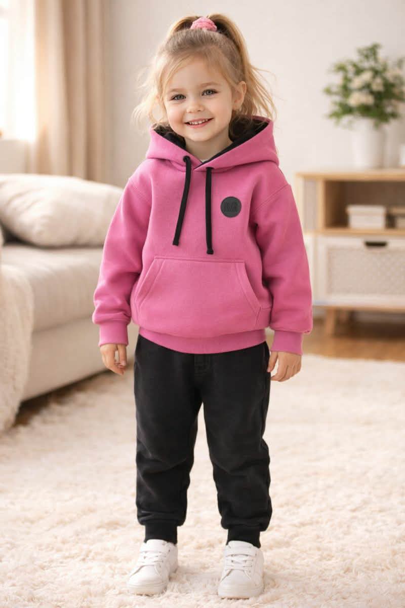 👕 Горно: Худи во впечатлива виолетова боја со качулка и врвки, џеб тип „кенгур“ за дополнителна практичност и мал круг принт кој додава спортски детаљ. Внатрешноста е фатирана, што го прави совршен за зима и есен.