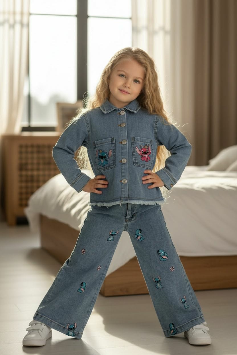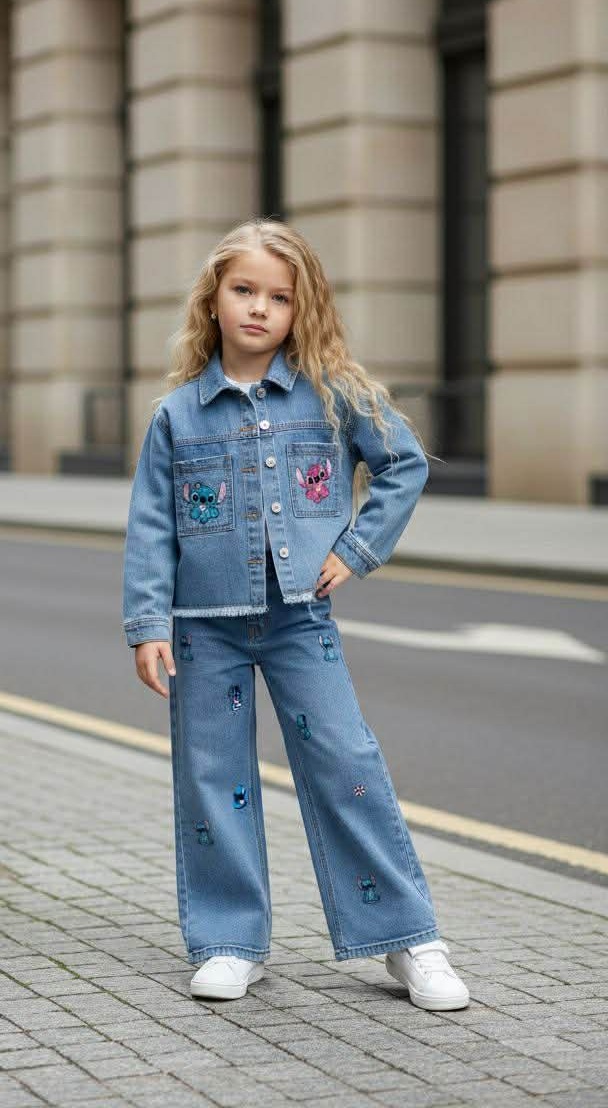 Разигран и модерен дводелен комплет од тексас со омилениот лик Stitch, создаден за девојчиња кои сакаат удобност и весел стил 🧸👧