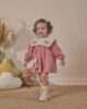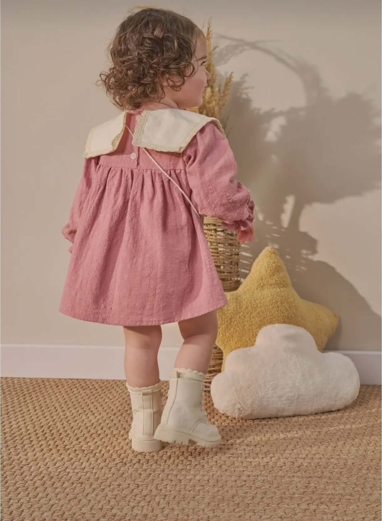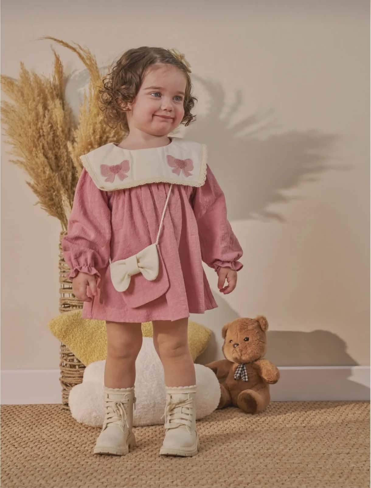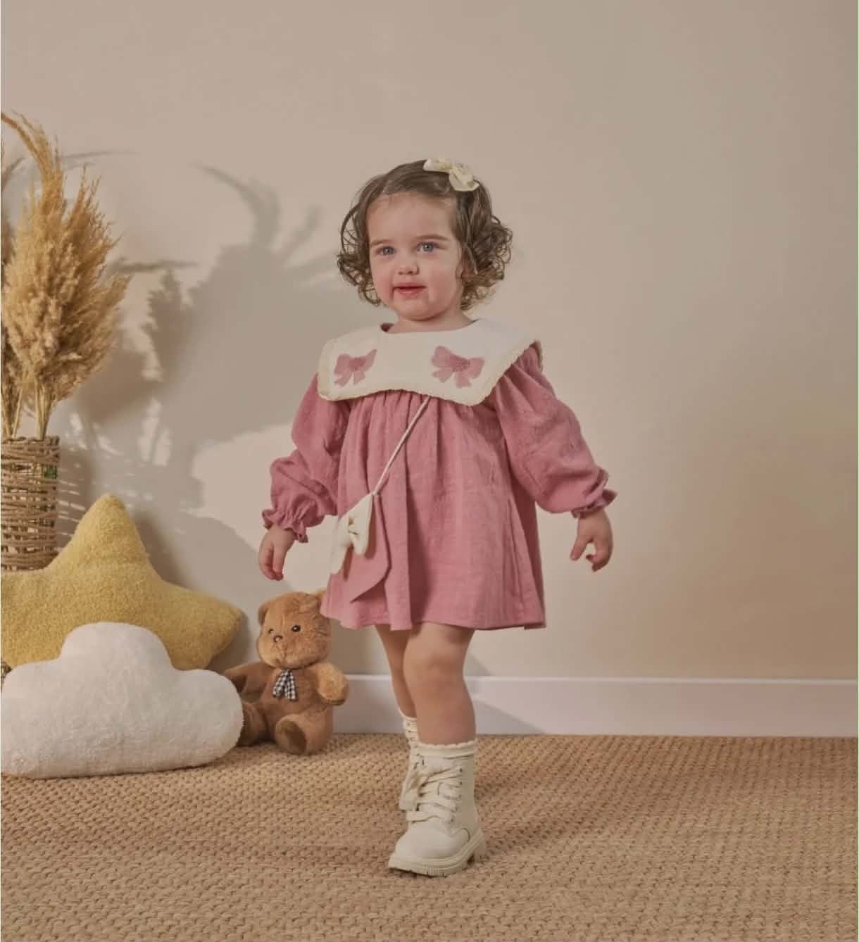 Дизајнот со бела декоративна јака и слатки машнички создава прекрасен контраст и додава посебен шарм на целиот модел. Лесниот и удобен крој овозможува слободно движење, па вашето малечко ќе се чувствува пријатно во текот на целиот ден. Овој фустан лесно се комбинира со чорапчиња, хулахопки или мали чизмички.
