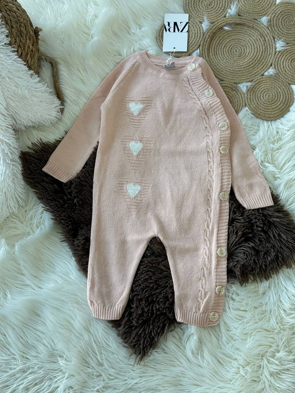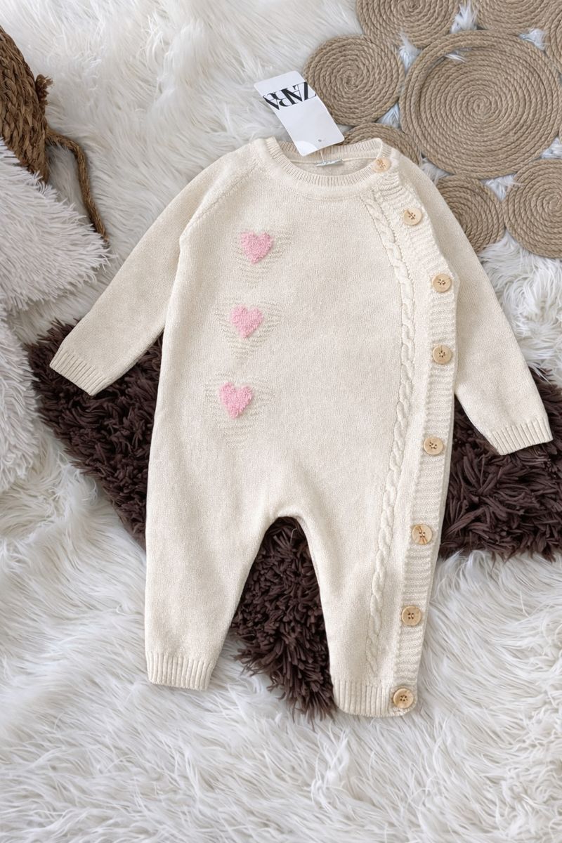Шпикозната е целосно плетена, со мек и пријатен материјал кој обезбедува топлина и удобност без да ја иритира бебешката кожа. Декорирана е со нежни срценца кои ѝ даваат сладок и елегантен изглед. Практичното копчање од страна овозможува лесно облекување и пресоблекување.