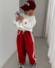 • Црвени панталони со линии кои ја комплетираат комбинацијата со белата блуза.