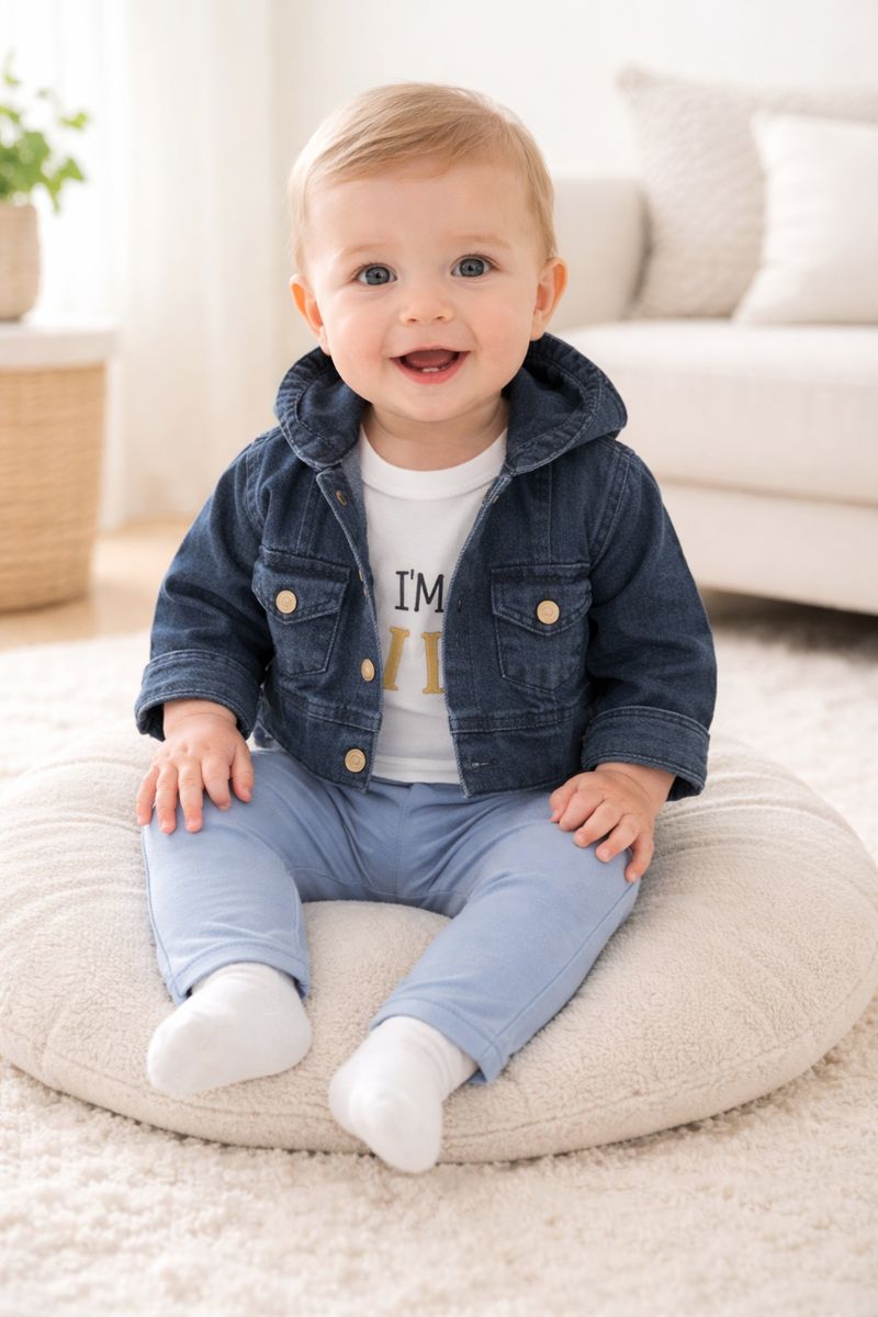 Јакничката е од памучен тексас материјал, мека и удобна, со копчиња напред за лесно облекување. Дизајнот со џебчиња и капуљача дава модерен и разигран изглед, а воедно обезбедува дополнителна заштита при посвежо време.