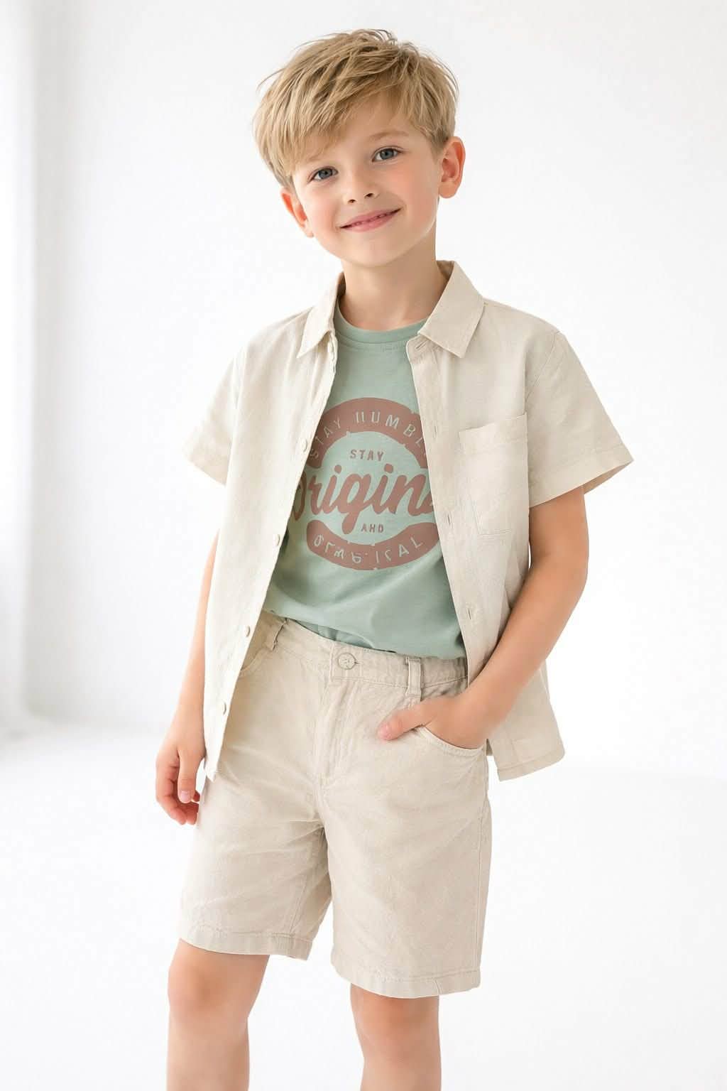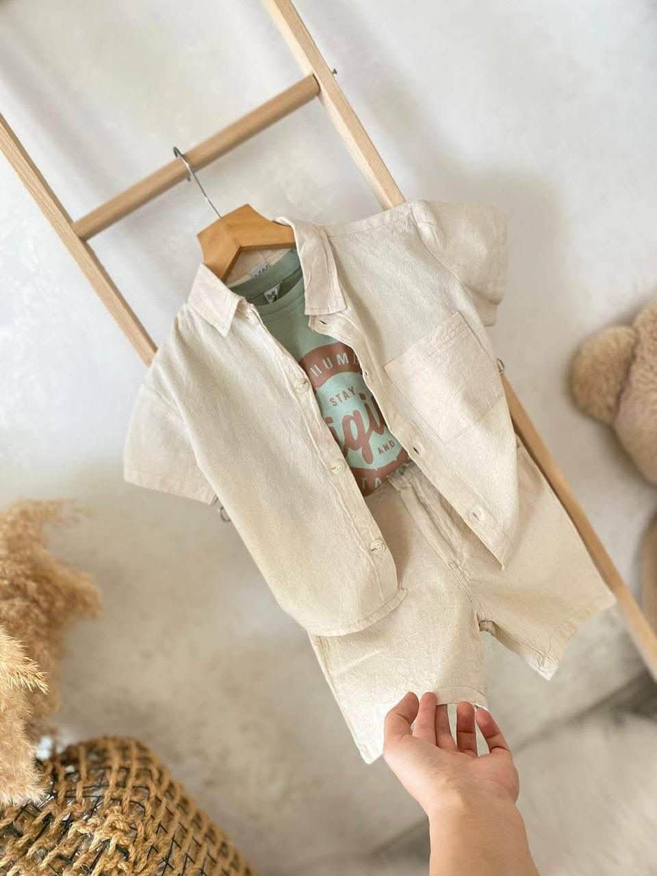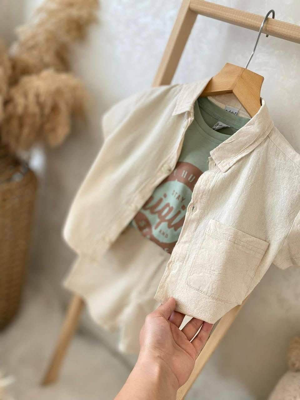 Лесна кошула со кратки ракави, отворен стил за layering 🌬️ Изработена од памучен материјал, совршена за топли денови. Бојата е кремаста/беж 🤍 што одлично се комбинира со останатите делови.